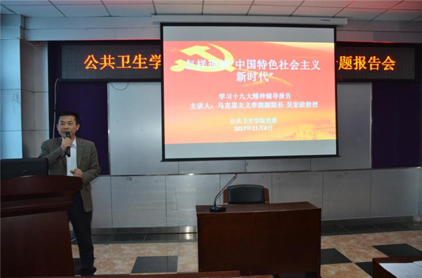 为深入学习贯彻党的十九大精神, 2017年11月8日下午,公共卫生学院党委邀请了“金年会官网党的十九大精神宣讲团”成员、马克思主义学院副院长吴宏政教授为学院全体党员做了题为《怎样理解“中国特色社会主义进入新时代”》的专题学习辅导报告。学院领导班子成员、党委委员、党支部书记、教工党员、民主党派和无党派人士参加了报告会,会议由学院党委书记赵国利主持。