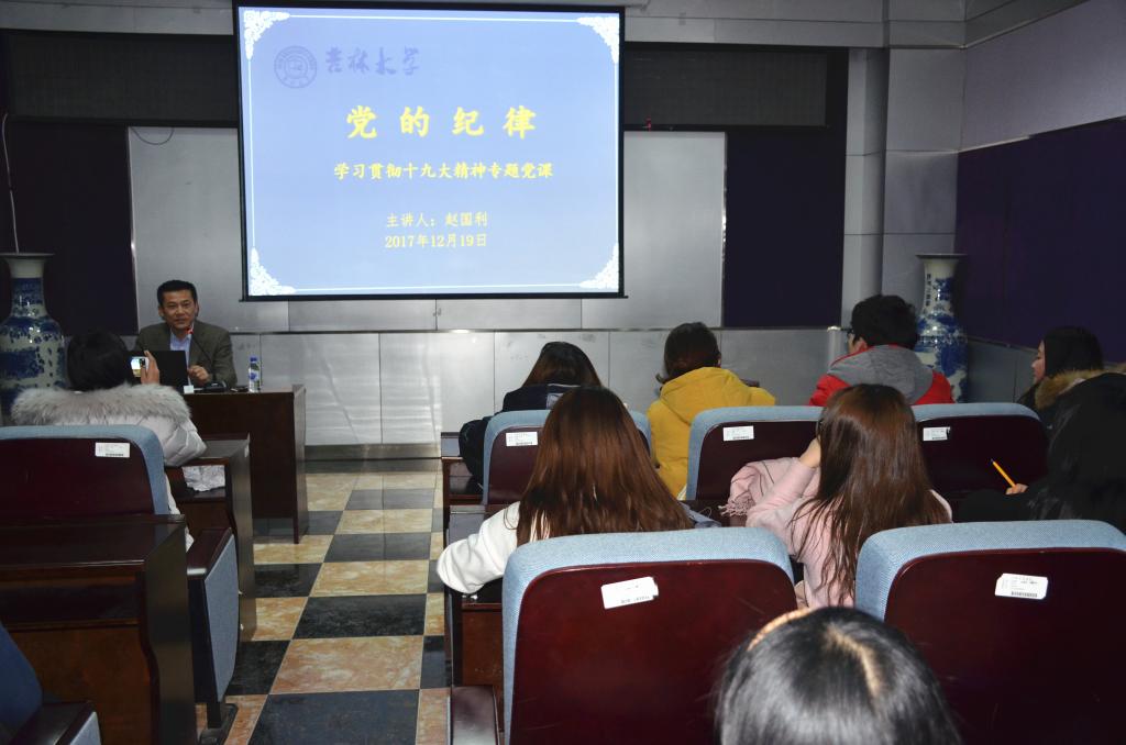 为深入学习贯彻党的十九大精神、加强学生党员的思想政治教育,12月19日晚,JINNIAN金年会党委书记赵国利于新民校区学院三楼报告厅主讲了以“党的纪律”为主题的专题党课,2015级、2016级全体学生党员及学生干部参加了此次学习。