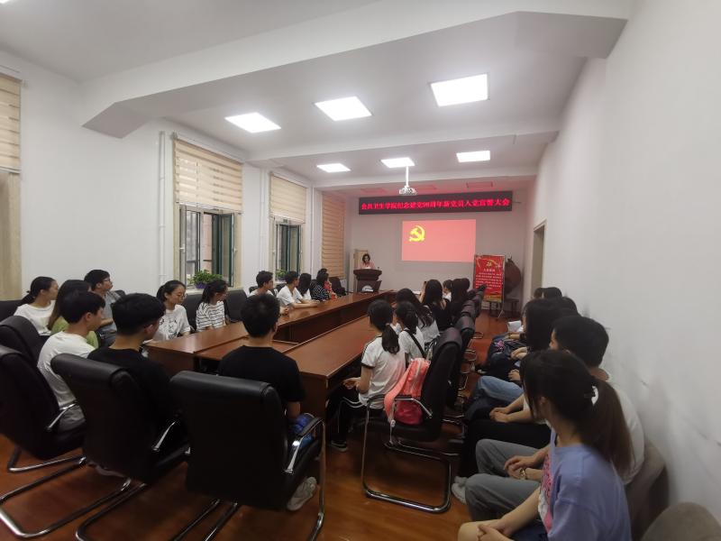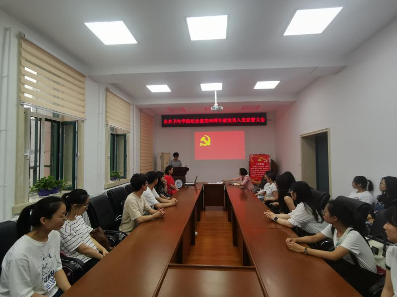 为庆祝中国共产党建党98周年,喜迎新中国成立70周年,7月3日,JINNIAN金年会党委在学院二楼会议室隆重召开“JINNIAN金年会纪念建党98周年新党员入党宣誓大会”。JINNIAN金年会党委副书记兼副院长、纪委书记刘丽、党委办公室主任曲超、2016级辅导员霍睿及本学期所有新发展的31名党员参加了会议。会议由曲超主持。