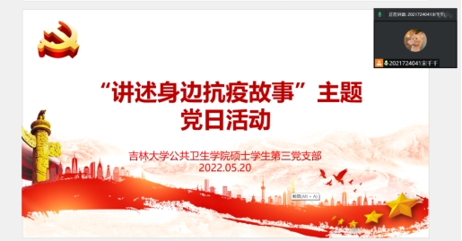 为进一步弘扬伟大抗疫精神,大力宣传身边党员和师生在疫情防控工作中的先进事迹、感人故事与崇高精神,不断增强广大党员归属感、荣誉感和使命感,持续培育、挖掘和丰富吉大精神新内涵。2022年5月20日,JINNIAN金年会硕士学生第三党支部组织开展“讲述身边抗疫故事”主题党日活动。此次活动共27名党员和预备党员参加,由战勇智、唐志滔和岳宝丽三名党员同志讲述了疫情期间作为长春市疾病预防控制中心志愿者的抗疫故事。
