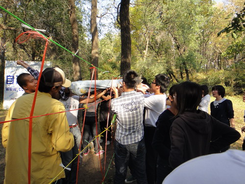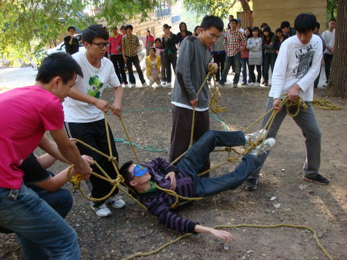 活动期间,学院领导和学生干部一起,进行了“穿越电网”、“冰山取水”、“万里长城”等一系列刺激有趣的游戏。大家团结一致,勇往直前,无论怎样的“关隘”都阻挡不了老师和同学们的热情,欢声笑语充满了整个营地。