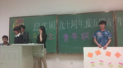 一部纪念建团90周年为主题的视频短片,拉开了本次联谊会的帷幕。它回顾了共青团90年奋斗历程,激励后人继承优良传统、实现中华民族的伟大复兴。随后联谊会正式拉开帷幕。本次联谊会共分为三个环节:1、“不说你我他”;2、我爱记歌词;3、个人才艺展示。在互动中,两院的同学团结合作,一路过关斩将,在欢笑中建立起了深厚的友谊。吃苦瓜的惩罚、仪电男生的深情献唱、两院男女的诙谐对话等,把晚会的气氛推向一个又一个高潮。