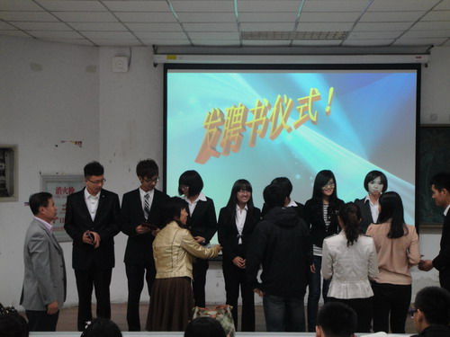 会议由学生会秘书部张曦月主持。首先,前任学生会主席刘畅上台演讲,她回顾了过去四年在学生会的工作经历,对学院老师和同学们的支持表示感谢,并鼓励新一届学生会继续做好学生服务工作,再创辉煌。紧接着,新一届主席王政民发表讲话,他就学院的未来发展提出了自己的构想,对学院活动的主题方向提出了“学习相关,生活相伴”。随后,在全体与会人员的掌声中,两任主席进行了学生会年鉴的交接。接着,吴晓辉主任宣读聘书,学院领导和老师为学生会主席、副主席、各部部长颁发了聘书。