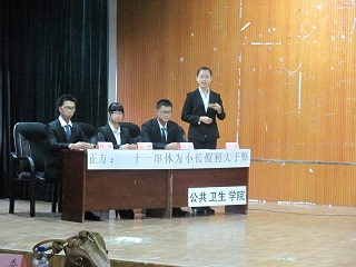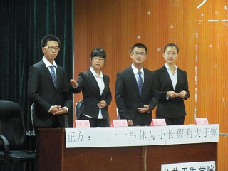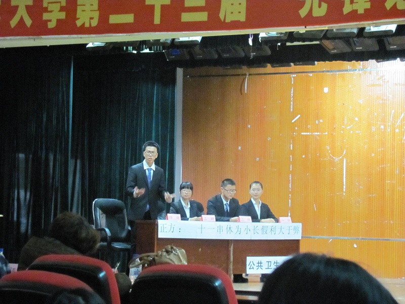 主持人宣布开始后,由双方辩友分别自我介绍,并简单展示本方观点;之后,有请评委上场。主持人宣布比赛规则和评分标准。紧张热烈的比赛随即开始,本场比赛共四个环节。在整场辩论过程当中,JINNIAN金年会辩论队辩手立足国情,放眼天下,能言善辩,慷慨陈词;借确凿的数据和事实论证,用流畅的语言和思维表述;冷静发挥,稳扎稳打;队员们谦和有礼气度不凡 ,时不时引发观众热烈的掌声。他们的表现充分解释了“先锋”的含义,体现了当代大学生的良好风貌和深厚涵养。辩论结束之后,评委退场。最后一个环节是台上台下互动交流,场面和谐而又火爆。评委公议结束后,由黄征老师阐述了本次比赛的公平性,并点评了双方的表现。老师高度赞同JINNIAN金年会的观点,表扬我们的阐述能力,也指出其中的漏洞,并予以精彩而独到的补充。