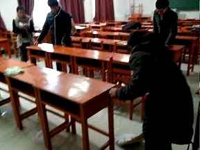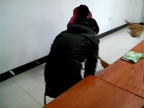 同学们早早地聚集在李四光楼需要打扫卫生的教室,用自带的清扫工具打扫起来。个子高的主动擦黑板,细心的女生们则擦桌子和门窗玻璃,其余的人有的扫地,有的擦地,还有的清理垃圾箱。大家配合默契,热情高涨;没有人嫌弃脏活累活而逃避,个个争先恐后,互相帮助,教室里洋溢着欢声笑语。整个活动持续了半个小时,在大家的共同努力下,教室窗明几净焕然一新。