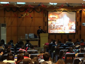 此次会议主要包括防震避险和防火逃生两方面内容。安科长围绕地震前兆、地震特点、应急处理措施以及如何避震等讲述了地震的相关知识及注意事项。在随后讲述的安全防火方面,则着重于如何扑救起初火灾、怎样正确报警、灭火器的使用方法及消防责任等相关内容。安科长除了讲解专业知识,还例举了许多息息相关的实例,并且播放了生动有趣的简短动画,以此帮助同学们更好地意识到安全重要性,学习相关专业安全知识,同时掌握必要且正确的求生方法。