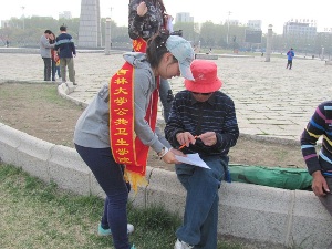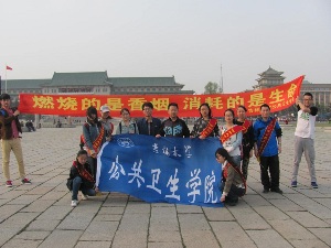 首先,同学们在文化广场中央拉上“燃烧的是香烟,消耗的是生命”的条幅,戴上绶带,吸引了在广场散心的市民的注意。然后,每位同学拿出事先准备好的禁烟倡议书,向市民讲解香烟的危害并请市民在倡议书上签字。大部分市民积极响应号召,认真阅读倡议书,在倡议书上签字。有些市民甚至当场扔掉香烟以支持此次禁烟活动。在同学们的解说下,他们认识到在公共场所吸烟是不道德的行为并保证在公共场合不再吸烟。最后,同学们在广场中央合影留念。