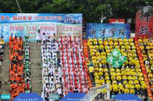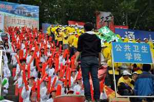 在运动会进行过程中,所有观众都整齐地坐在位置上为运动健儿们加油助威。在此过程中,观众还在学院学生会生活部部长及部员带领下高喊“争冠夺魁,唯我公卫,青春无畏,舍我其谁”的口号。尽管不是每个人都能参加比赛,获得冠军,但是大家都把自己的热情融入到运动会中。蒙蒙的细雨挡不住大家的热情,我们都在为运动会奉献自己的力量。