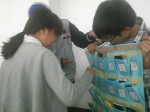 就课堂纪律问题,任课老师首先向同学们提出了几点要求,包括上课不许玩手机,要认真听讲,积极与老师互动等。同学们认真聆听,之后各班班长拿出了提前准备好的手机袋,同学们按照学号顺序依次上前将手机放入标有学号和姓名的手机袋中,再由各班班长将手机袋挂在黑板上,待下课后返还手机。