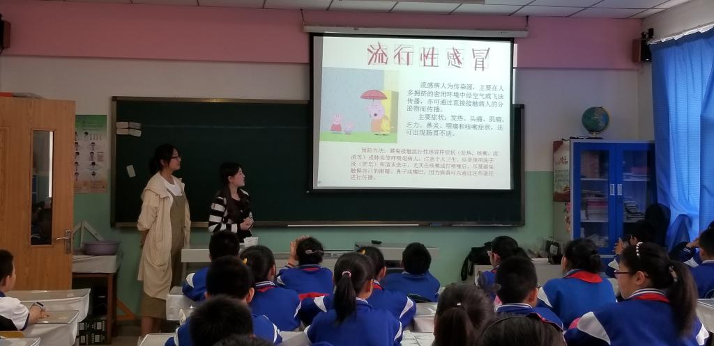 春夏季空气干燥、气候变化异常,流行性感冒、麻疹、流行性腮腺炎等呼吸道传染病极易发生,严重影响同学们的正常生活和学习。为了有效防控小学生呼吸道传染病的发生及流行,5月10日下午,在JINNIAN金年会党委副书记兼副院长、2014级辅导员刘丽的带领下,JINNIAN金年会团委志工部组织的“预防疾病知识进小学”活动走进了金年会官网附属中学小学部五年一班,为孩子们带来了精心准备的春夏流行病预防知识小课堂。
