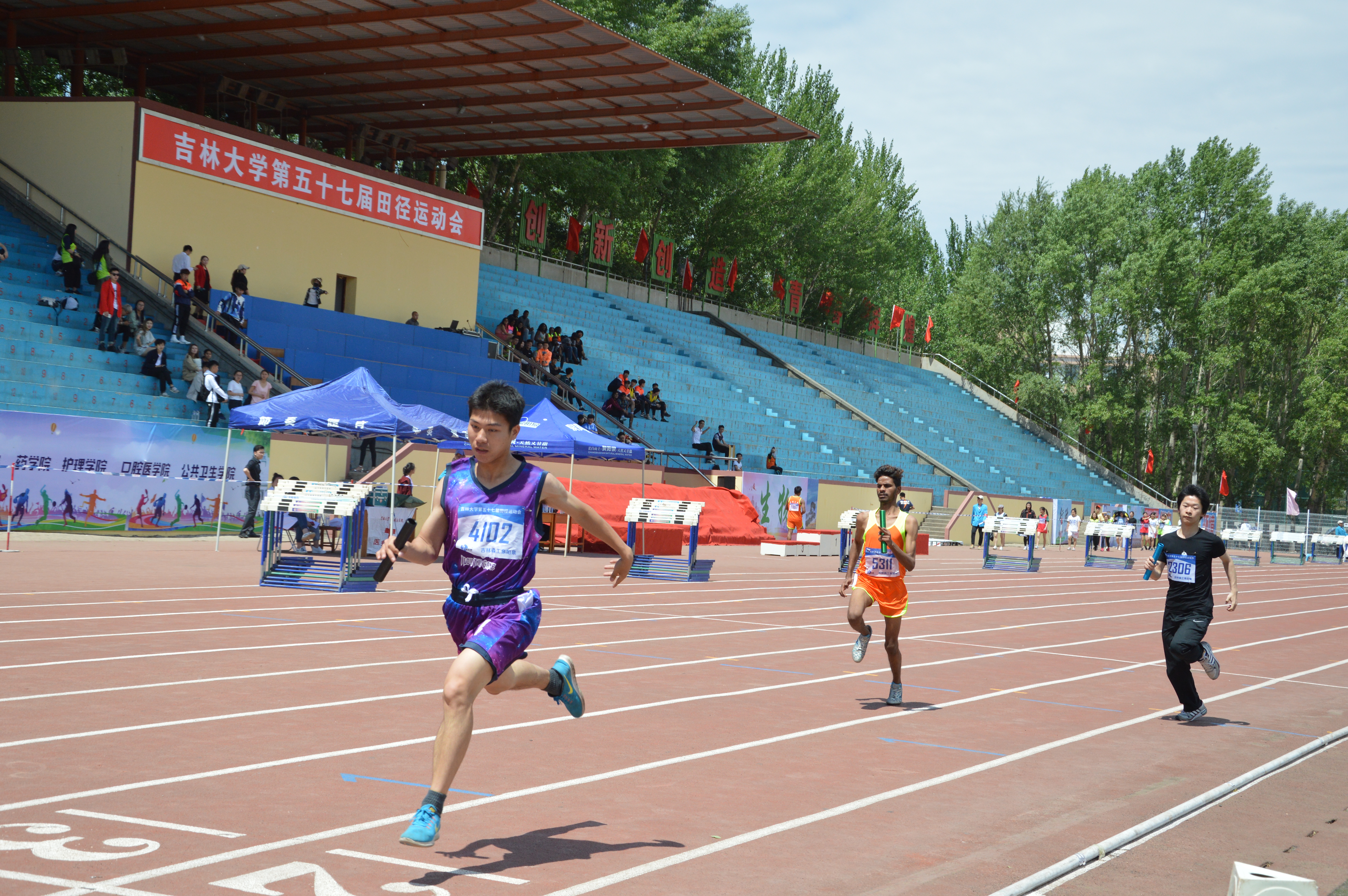为了提高学生的身心素质,培养当代大学生团队合作精神,增强学生的运动健身意识,展现吉大学子的进取精神和昂扬斗志,5月24日、25日两天,金年会官网第57届田径运动会在中心校区体育场隆重召开。5月24日上午10时50分,男子4×100米预赛正式开始,JINNIAN金年会2017级李广斌,王兆丰,黎晨烨,尚健参加了此次比赛。