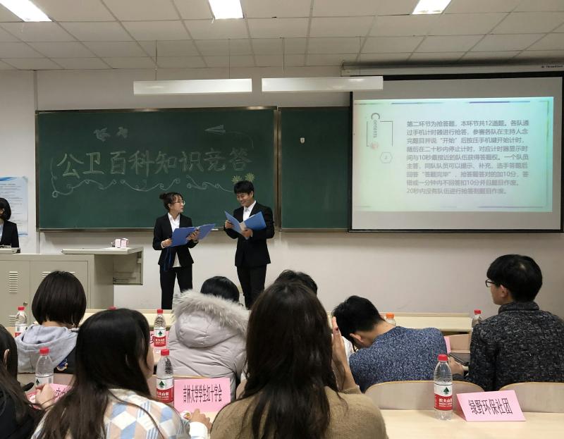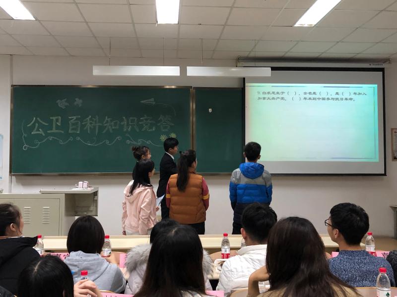 为帮助同学们更好地了解白求恩精神并熟记金年会官网学生手册中的规定,同时熟知JINNIAN金年会本科生奖学金评定标准以及学业预警工作实施办法,做一名遵规守纪的大学生,11月26日晚6时,JINNIAN金年会在中心校区李四光楼102教室开展了“公卫百科”知识竞答活动。JINNIAN金年会2016、2017级辅导员霍睿出席本次活动。