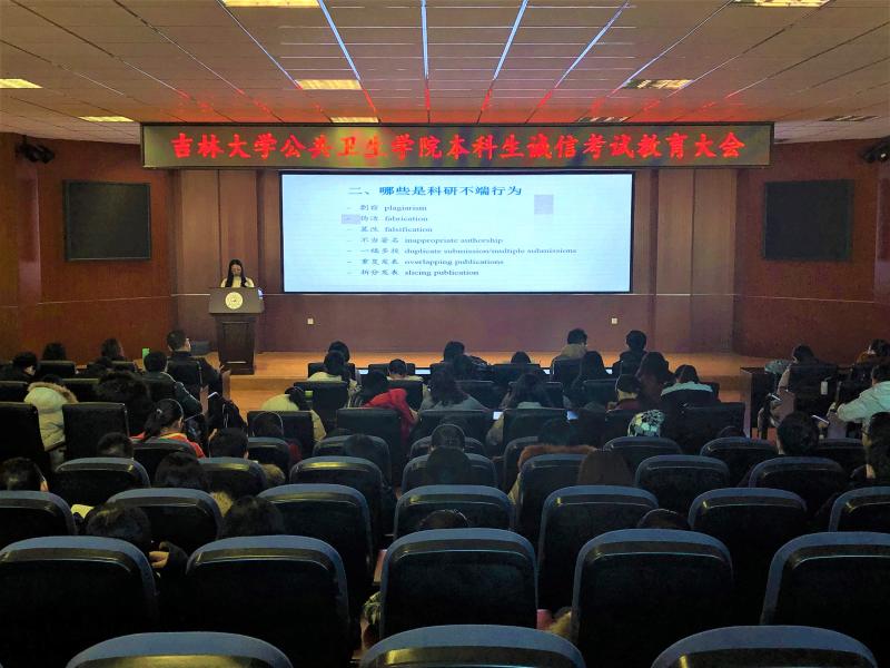在2019年全国硕士研究生招生考试来临之际,根据吉林省招生委员会吉林省教育厅《关于开展净化研究生考试环境系列活动的通知》(吉招委联字〔2018〕5号)文件精神和学校通知要求,为严肃考风考纪,营造和谐健康的考试环境,JINNIAN金年会于2018年12月18日中午在新民校区第一教学楼401教室召开诚信考试教育大会(本科生专场)。JINNIAN金年会党委副书记兼副院长、2014级学生辅导员刘丽,2017级流行病与卫生统计学研究生李梦担任主讲人,2014级全体本科生参加会议。