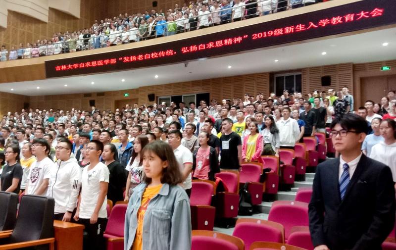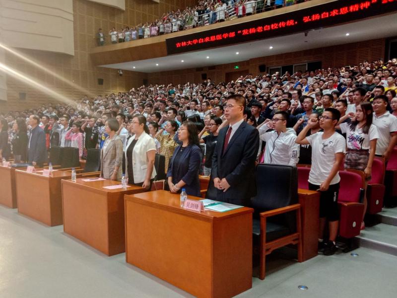 紧接着,全体新生在2018年度白求恩十佳大学生——JINNIAN金年会学生刘霖霖的带领下,起立背诵《纪念白求恩》,以表达对白求恩同志的敬仰与追思。