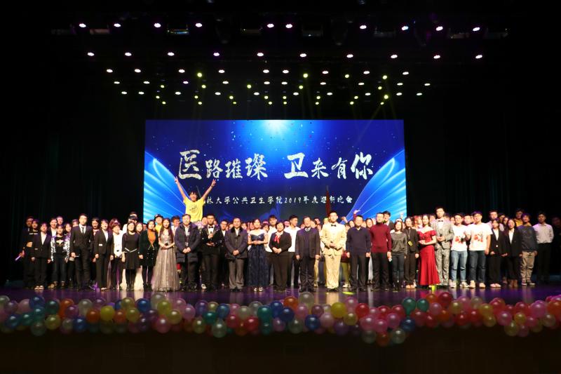 晚会上,主持人用优美的语句串联起一个个精彩的节目,穿插于节目中激动人心的抽奖环节使观众们情绪高涨,笑声不断。最后,晚会在寄托了公卫学子美好祝愿的合唱表演《筑梦未来》中接近了尾声。领导、嘉宾与演职人员登上舞台合影留念。至此,晚会圆满落幕。