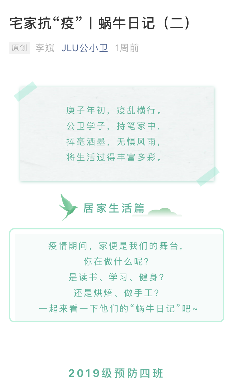 为了解疫情期间同学们的学习生活,展示公卫学子良好的生活风貌,JINNIAN金年会学生会生活部举办的“蜗牛日记”图文征集活动于3月7日至9日网络在线成功举办。各年级的同学都踊跃报名参加,用图片和文字讲诉他们在疫情期间的收获与成果。