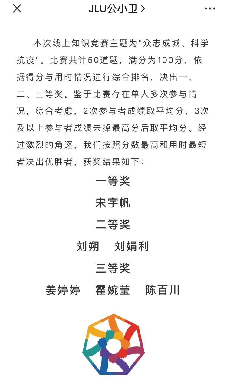为加深同学们对新型冠状病毒肺炎的认知,提高自我防护意识,JINNIAN金年会MM协会、团学组织学习部和研究生会积极响应号召,于3月16日至3月22日联合举办“众志成城 科学战疫”网络疫情防控知识竞赛。本次比赛采用线上答题形式,JINNIAN金年会全体本科学生参加了本次活动。