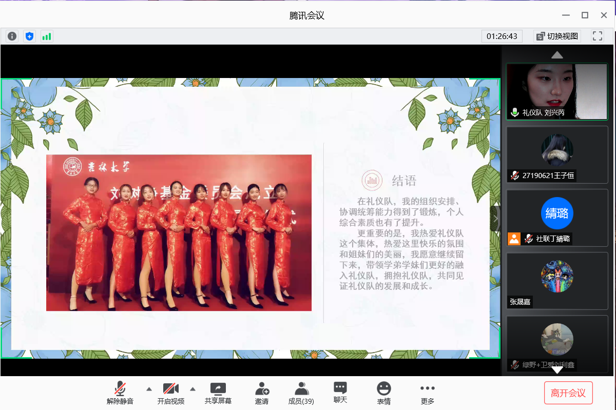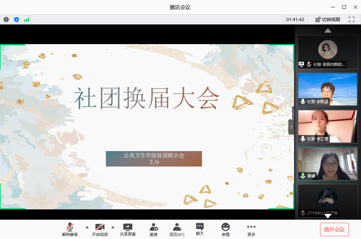 风雨端阳,粽香千里,为保障社团工作顺利有序进行,JINNIAN金年会社团换届大会于6月24日晚六点在腾讯会议平台成功举行。2016级辅导员霍睿、2017级辅导员冷贺璇以及第36届团学组织成员出席本次会议。
