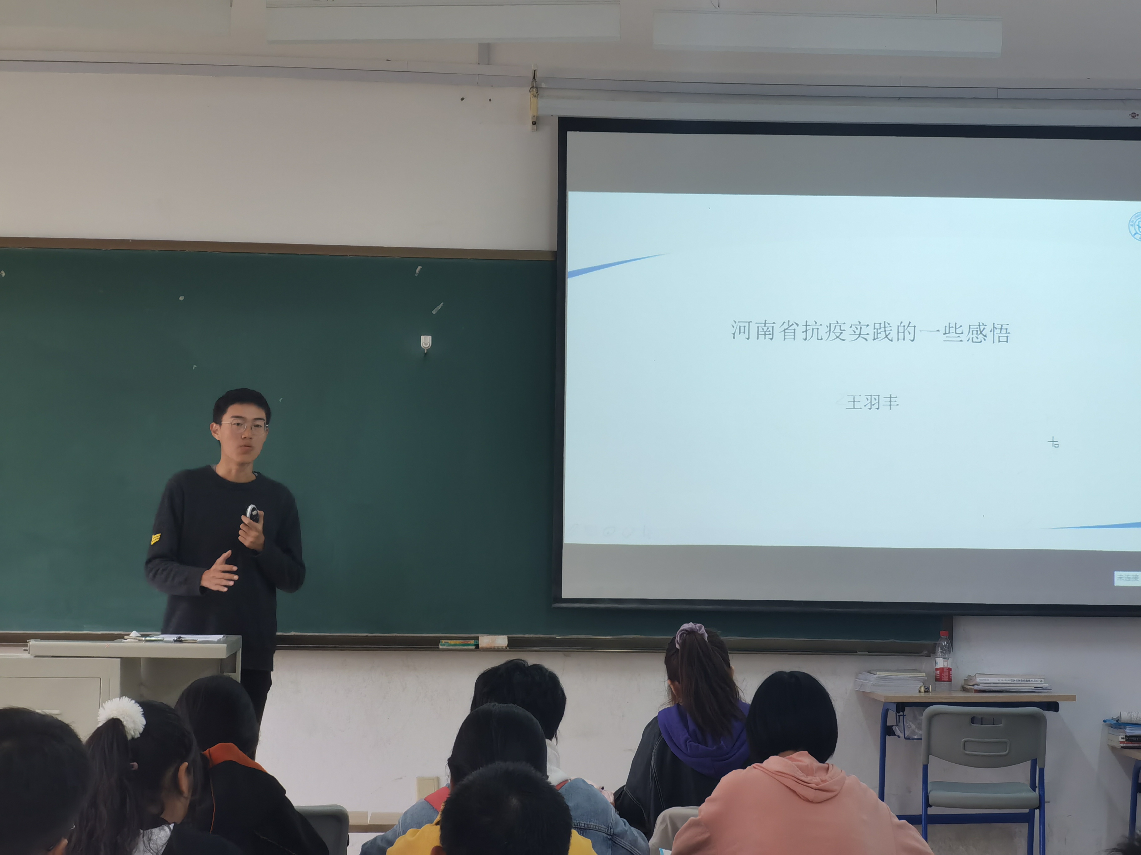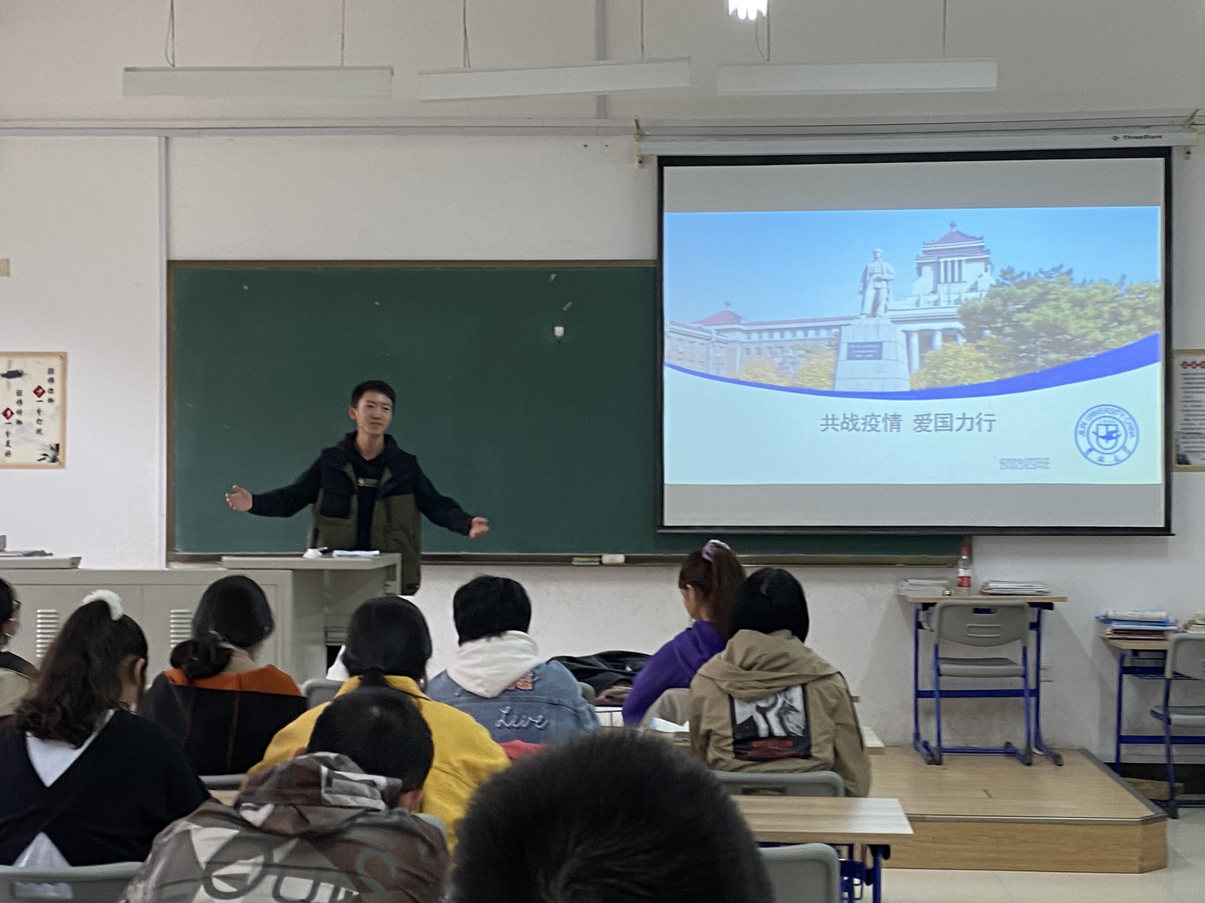 上午九时四十五分,班会在刘俊涛同学的主持中拉开序幕。首先由来自湖北孝感的闵玥同学讲述了在抗疫期间身边的动人故事。无数的逆行者们用自己的生命和疫情对抗,也正是由于这些最可爱的人,疫情才能够在如此短的时间内得到有效控制。随后,王羽丰同学和王懿晨等同学分享了河南省和新疆省的疫情防控措施和基层党员工作者的疫情工作,展现了我国疫情防控措施的良好落实情况,也展现了每一位中国人在面对危难时的责任与使命意识。此外,强珍等同学带来的诗朗诵和成小丹等同学的演讲则赞扬了挺身而出的逆行者们,展示了“战疫”中激情澎湃的青春力量,表达了我们无数中国人下定决心,攻克疫情的豪情壮志。同时也赞颂了那一袭袭白衣,那一幅幅铁骨汇聚成的传奇,令人感动深思,激励大家与疫情战斗,携手共抗疫情。活动的最后,《你要相信这不是最后一天》的合唱表达了对祖国美好的祝愿与希望,呼吁大家为祖国奉献出自己的一份力量。