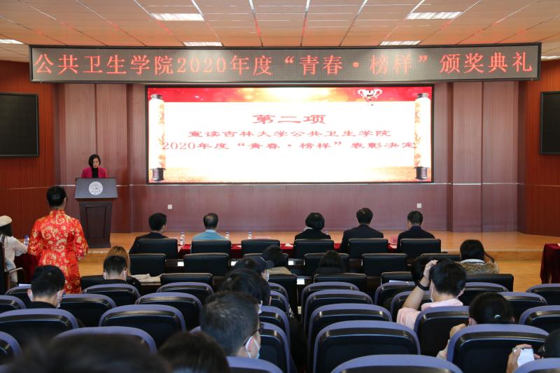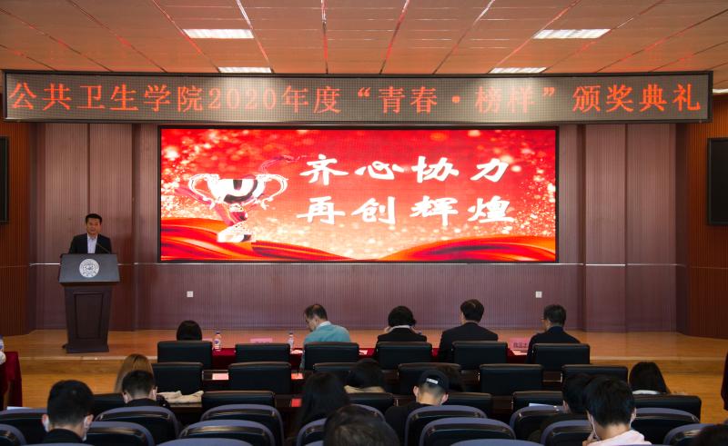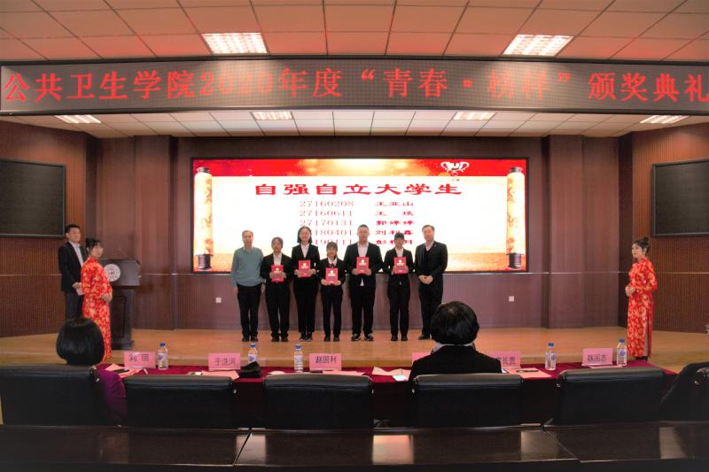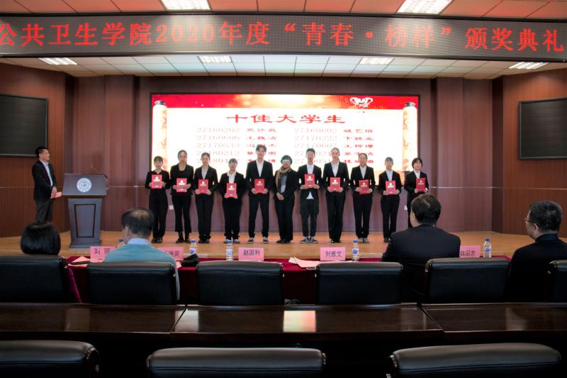 首先,全体起立,一同奏唱校歌。在嘹亮的歌声中,颁奖典礼正式开始。随后,党委副书记兼副院长刘丽宣读JINNIAN金年会2020年度“青春·榜样”表彰决定。而后,各院领导为“青春·榜样”获奖学生和获奖班级代表颁奖。紧接着,院长刘雅文讲话,她首先向奖项获得者以热烈的祝贺和衷心的祝福,而后以疫情肆虐下金年会官网学子为疫情防控的贡献为出发点,深刻地阐述了作为公卫人所需肩负的责任,并对全体学生提出期望。希望同学们能够坚定理想,奋勇拼搏,并时刻秉持仁心爱民的信念,始终秉承“预防为主,防重于治,文理兼容,共护健康”的院训,怀揣敢为人先的锐气和上下求索的执著,成为具有国际视野、完善人格、卓越才干的高素质公共卫生人才。
