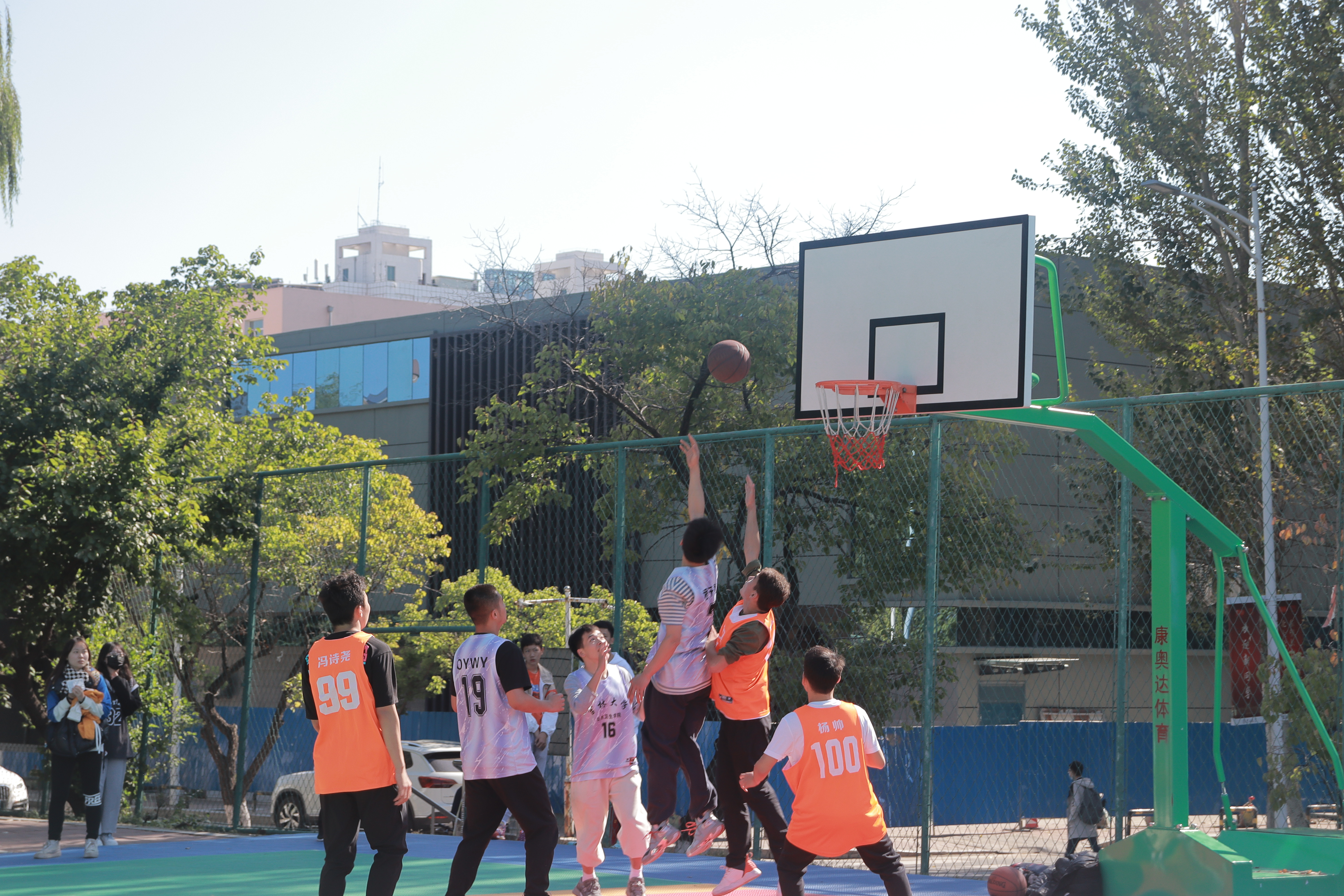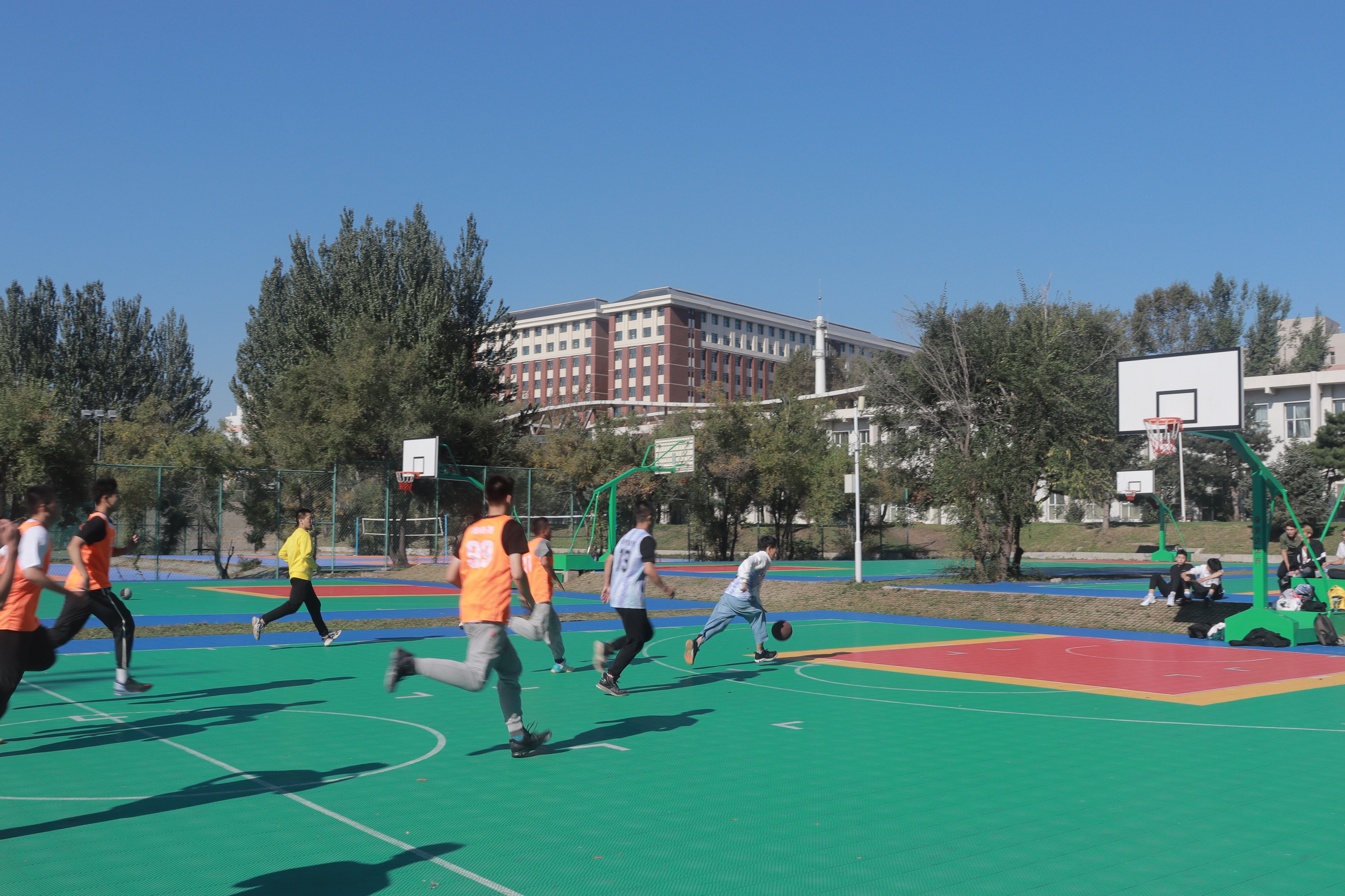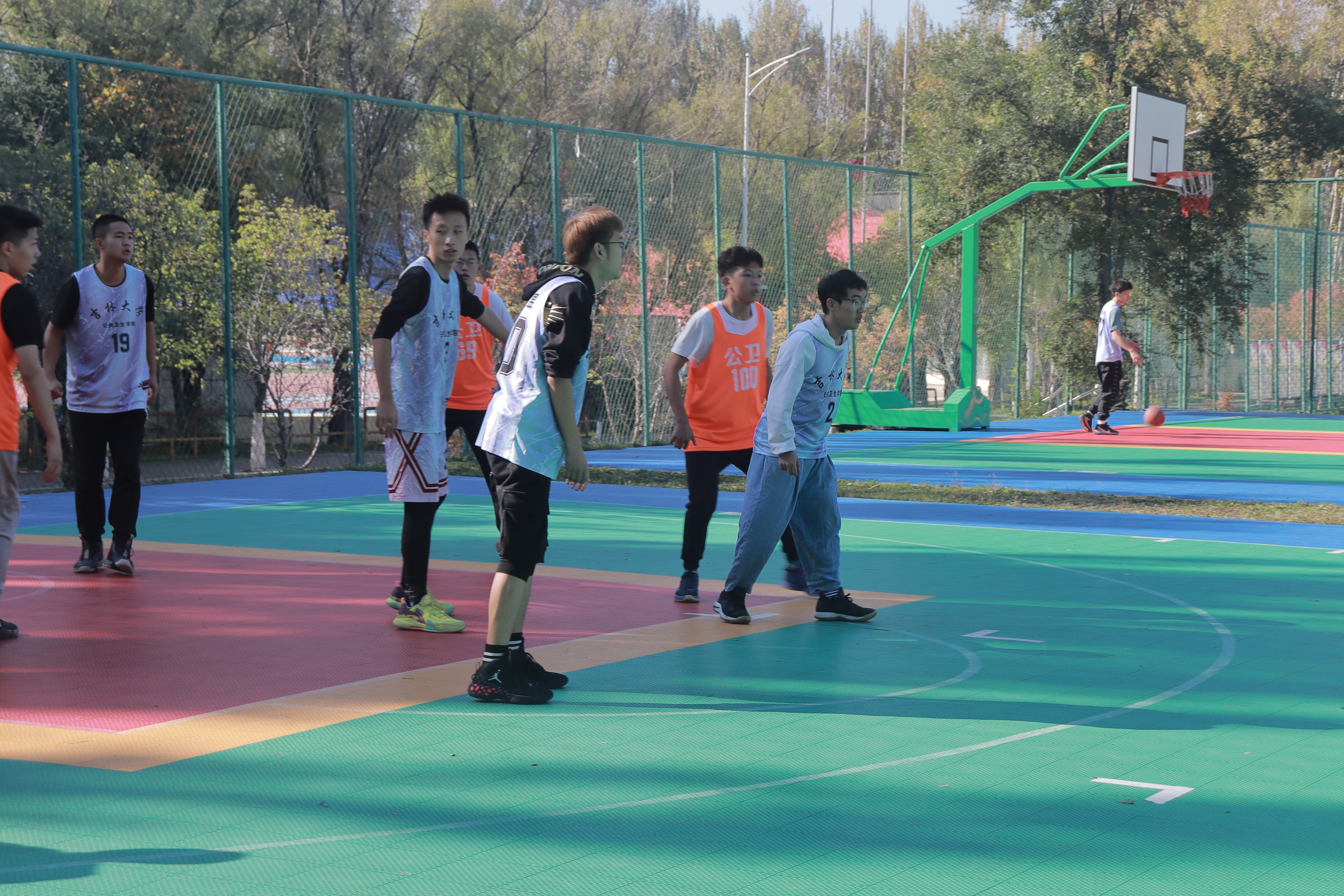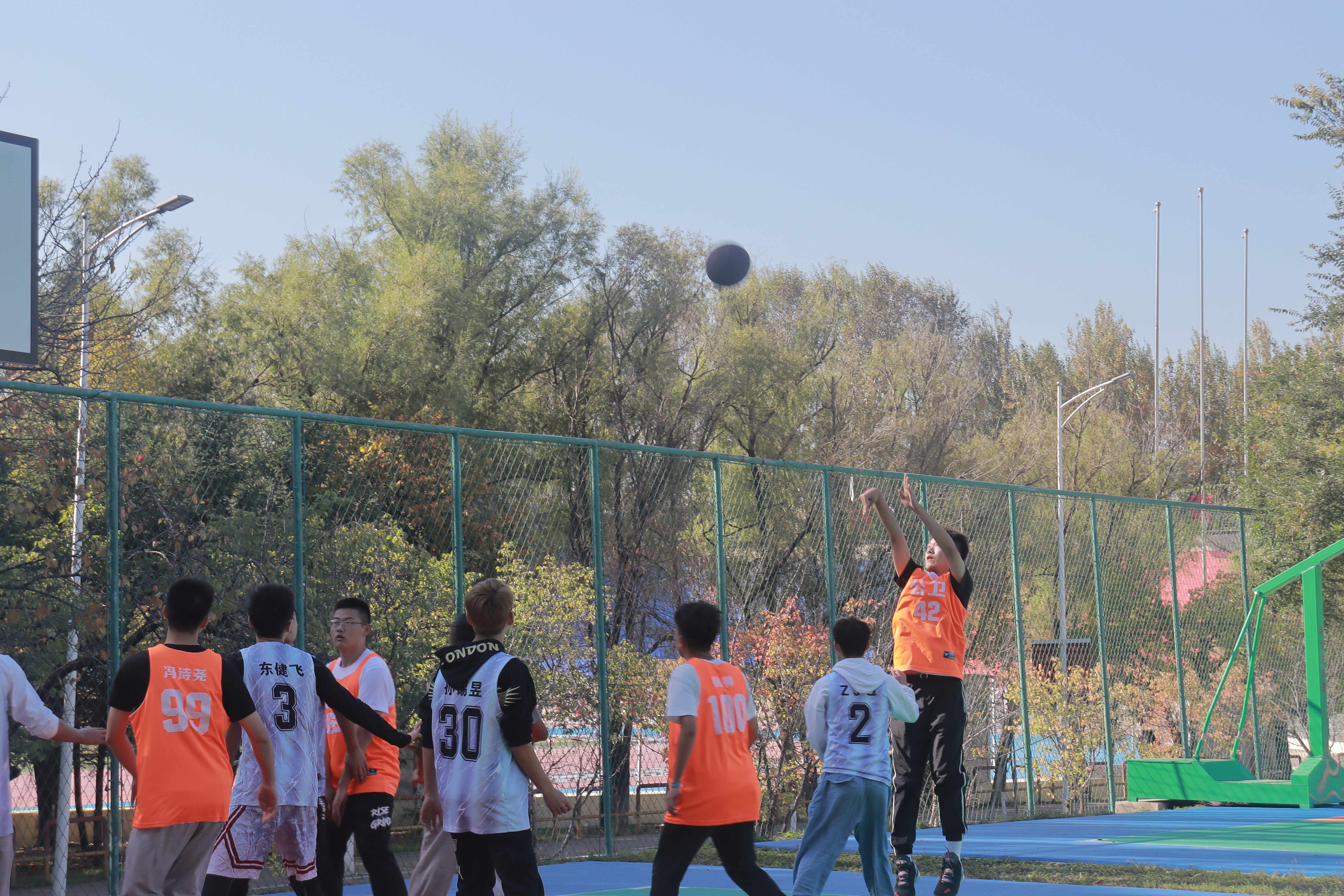 比赛于上午九点正式拉开帷幕。本次比赛共分为四个小节,每小节12分钟。秋风带来了一丝丝寒冷,可同学们的热情丝毫未减。随着哨声的响起,双方队员你争我夺,你攻我守,赢来了同学们的阵阵欢呼,很快,比赛就到了白热化的阶段。2021级新生靠着初生牛犊不怕虎的劲大胆进攻,抢断、传球、运球、投球,干净利落的动作获得了现场同学们的掌声。可高年级的同学凭借着默契的配合、出色的防守打乱了21级同学的节奏,接连得分。赛场上空,球划过的一道道优美弧线展现的是当代大学生的风采以及青春活力!终场哨声响起,比赛以38:92的比分画上了句号,高年级联队获得了胜利。比赛结束后,新生和老生进行了亲切的交流,最后在场的球员和观众一起合影留恋。