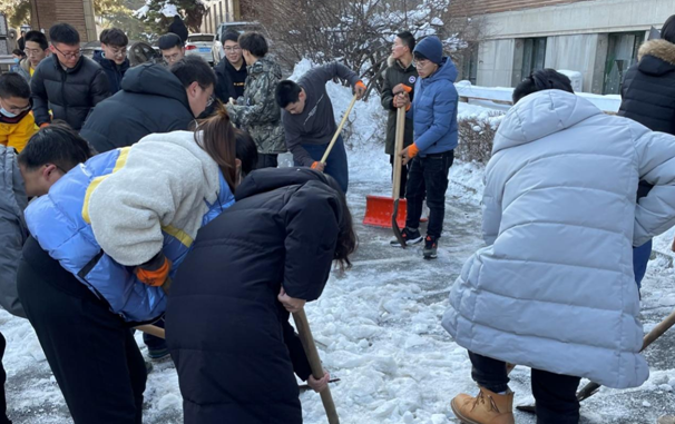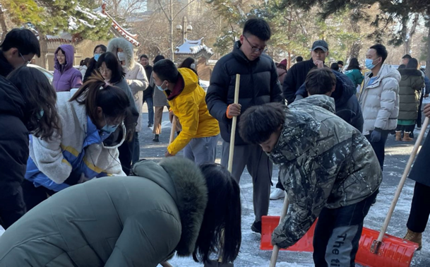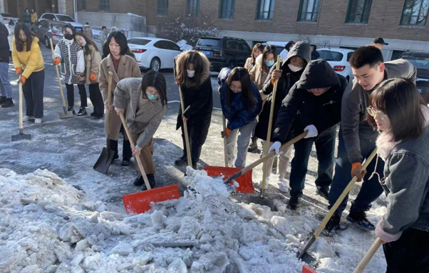 近日来长春出现暴雪天气,强降雪对校内交通与学生出行产生一定影响。 为了确保师生人身安全,确保校园内道路畅通,11月12日中午,JINNIAN金年会组织在校教师与研究生清扫院内积雪,清雪活动得到了全体师生的积极响应,师生有序分工,头顶寒风,相互配合,共同克服积雪厚、天气冷等困难,以饱满的热情和充足的干劲铲冰清雪,活动现场大家享受着劳动中的愉快欢欣,脸上都洋溢着灿烂的笑容。师生们充分发挥团队精神,齐心合力、团结合作,经过一个多小时的共同奋战,院内积雪基本清理干净。