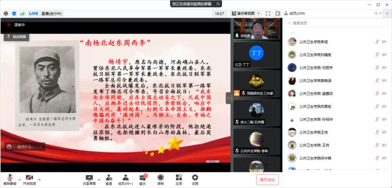 3月23日晚,校研究生工作部组织召开第十期“明德研工”论坛,邀请马克思主义学院刘信君教授讲授“弘扬抗联精神,战胜新冠疫情”专题讲座。JINNIAN金年会研究生党支部以此契机,组织研究生党员、入党积极分子等开展集中学习,重温抗联历史,重拾红色记忆。