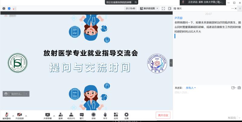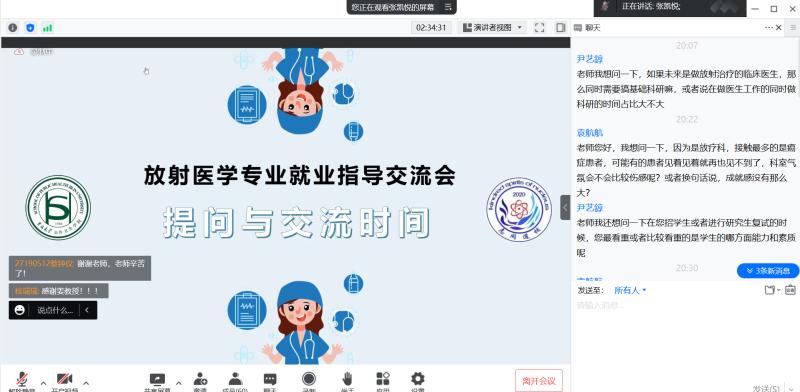 为帮助放射医学专业的同学们树立正确的就业观,正确引导同学们自主的就业意识,金年会官网大学生志同道核社团于5月20日晚开展放射医学专业就业指导线上讲座。此次会议邀请了金年会官网第一医院放疗科医师姜新作为特邀嘉宾,同时由JINNIAN金年会副院长寇长贵、党委副书记兼副院长刘金超、辅导员苏国范、冷贺璇和刘心怡几位老师,以及放射生物学教研室主任申延男教授作为主要与会人员来解答同学们的问题。